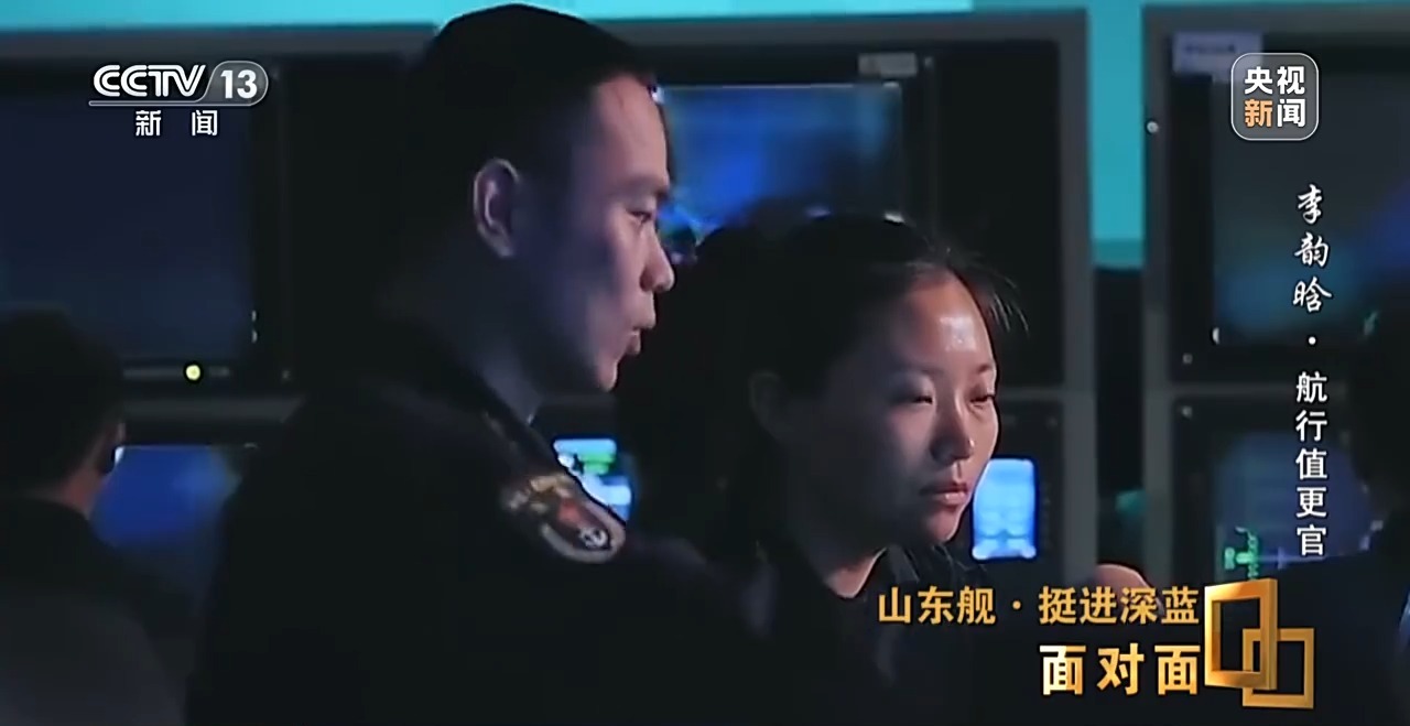 李韵晗,是舰上的首位女飞行值更官。飞行值更官负责指令舰艇的把持,需要及时包涵全舰各战位景况和海空情况。