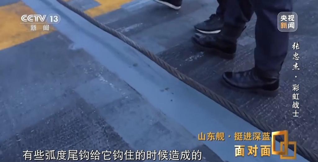 舟师山东舰 张忠杰:平时就要查验它的景况是何如样的,因为它中间这一块,有些弧度,尾钩给它钩住的时候酿成的。什么时候需要更换有个圭臬,通过我们东说念主员的查验来细目隔断索的景况,如果需要更换那就更换,不需要更换就连接使用。